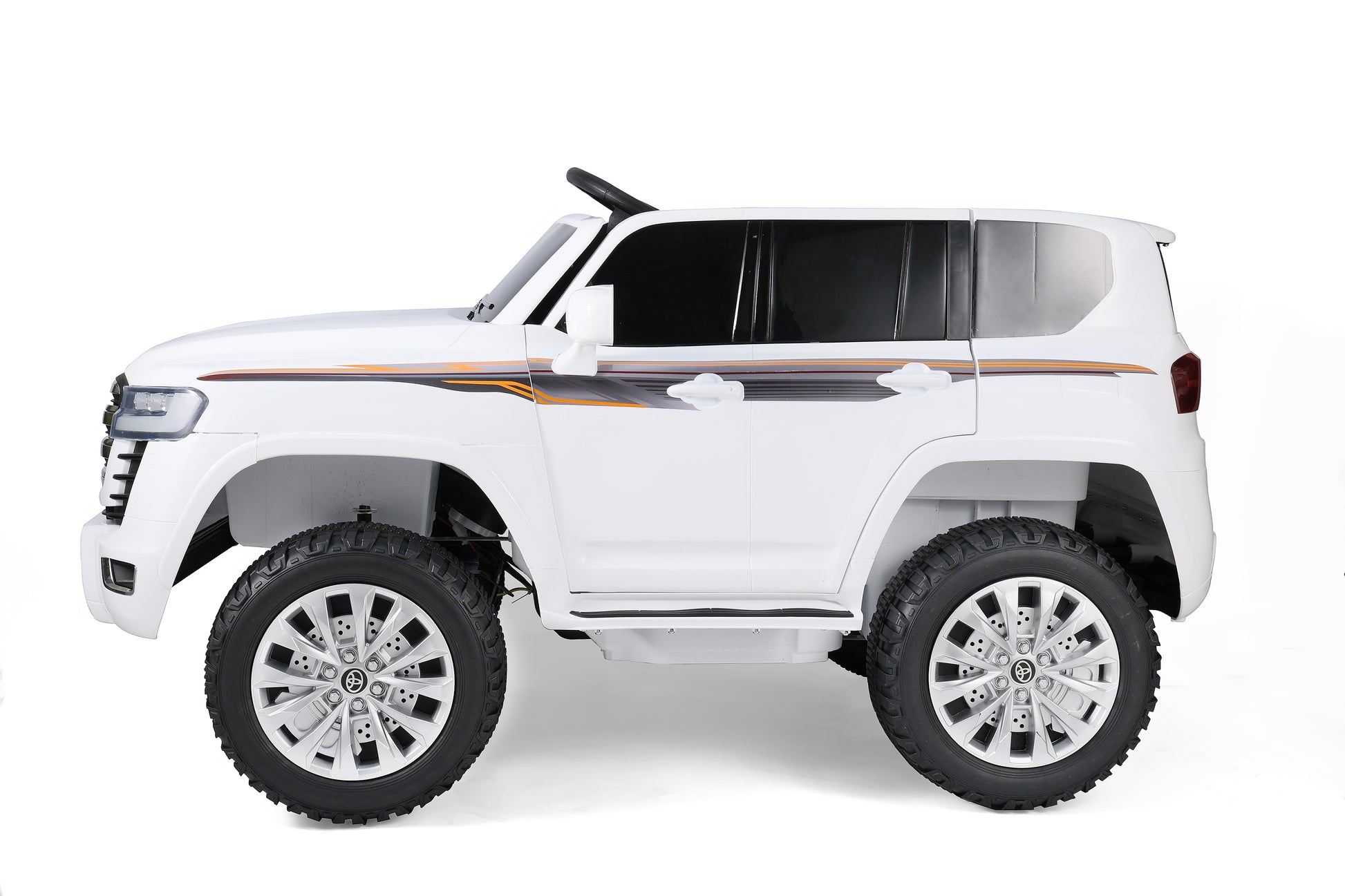 Double door,steering wheel one-button installation,central control panel, one-button start, 2.4G one-to-one Bluetooth remote control, 3-speed adjustment, slow start, swing, remote control one-button brake function, power display, Bluetooth player, early education function, English story, music, LED headlights, four-wheel shock absorber, Double seat, drag handle,EVA wheel,leather seat, front base plate with light
